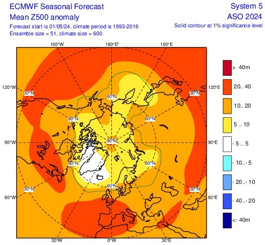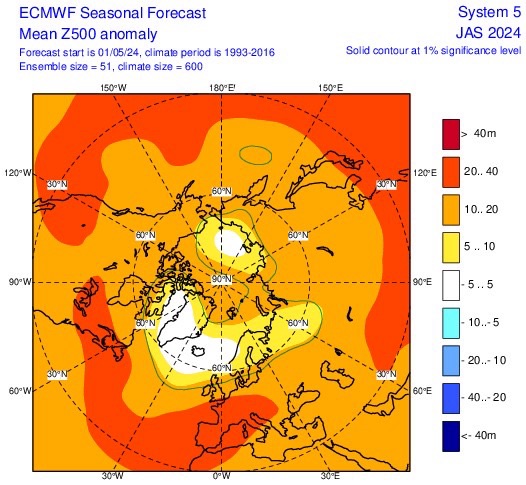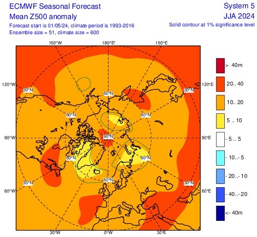 Prendiamo ora in esame le previsioni del centro meteorologico europeo (ECMWF) per i tre mesi estivi: