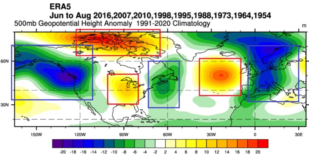Concentrandoci sulla parte europea dell’immagine, (fonte severe-weather.eu) episodi simili nel passato hanno portato alla migrazione dell’anticiclone delle Azzorre verso il Regno Unito e la risalita di quello subtropicale verso nord est. Tra i due anticicloni si verrebbe a creare una zona depressionaria vivace. A prima impressione, quindi, sembrerebbe possibile un’estate mediamente fresca e piovosa. Il problema risiede nel fatto che in questo pattern due terzi degli anni presi in esame siano prima del 2000, anno spartiacque per le estati europee a causa del riscaldamento globale.